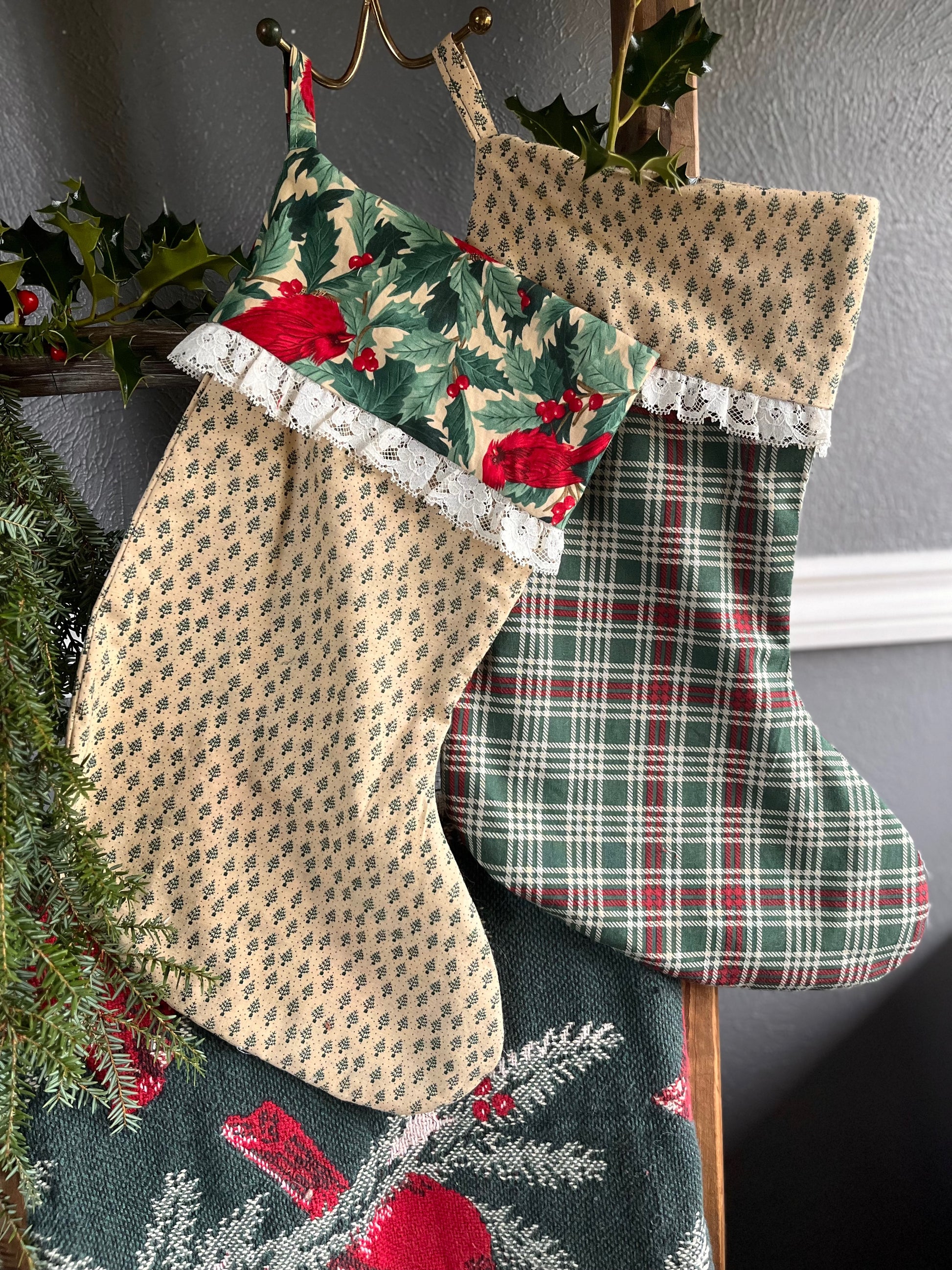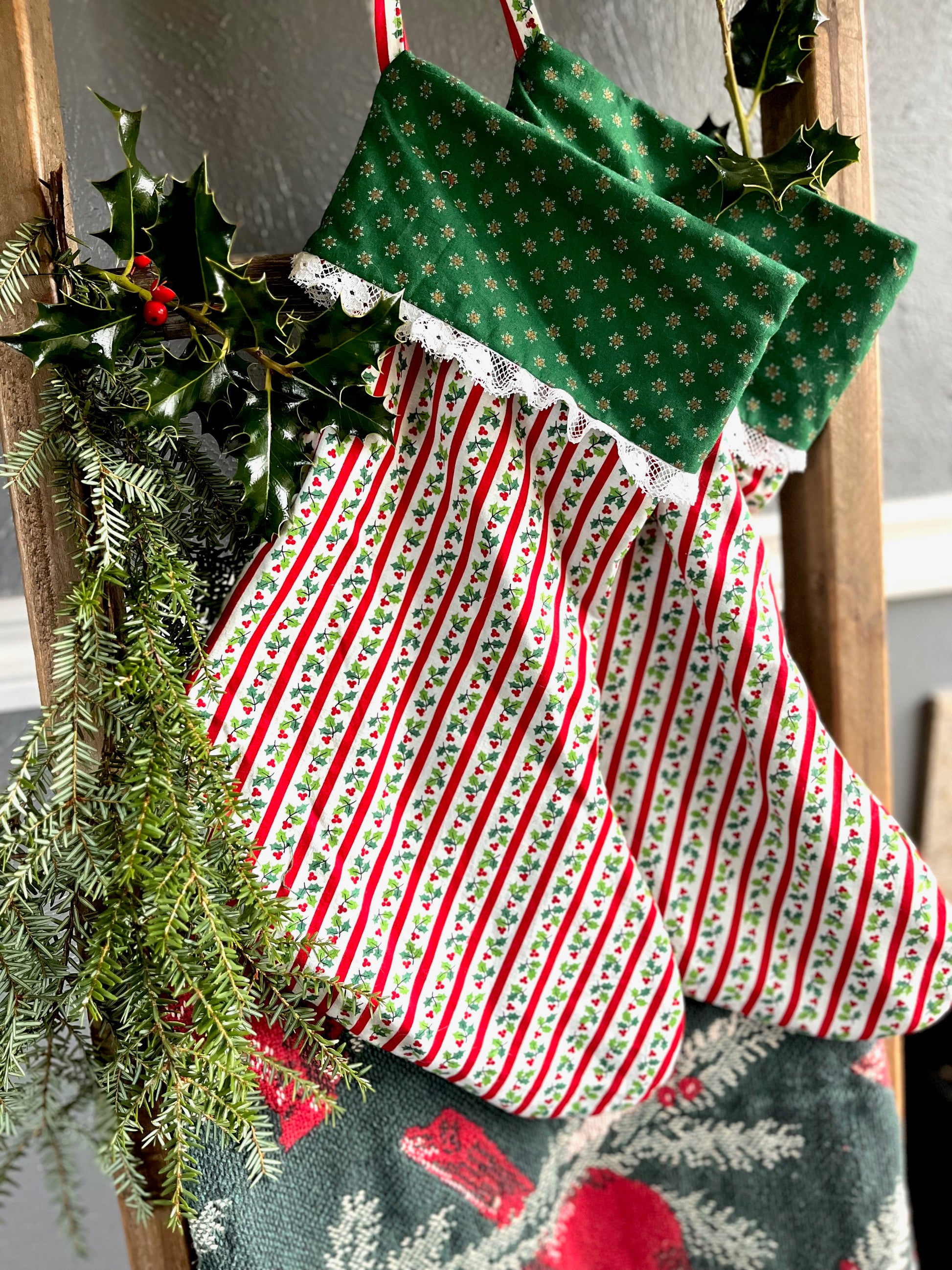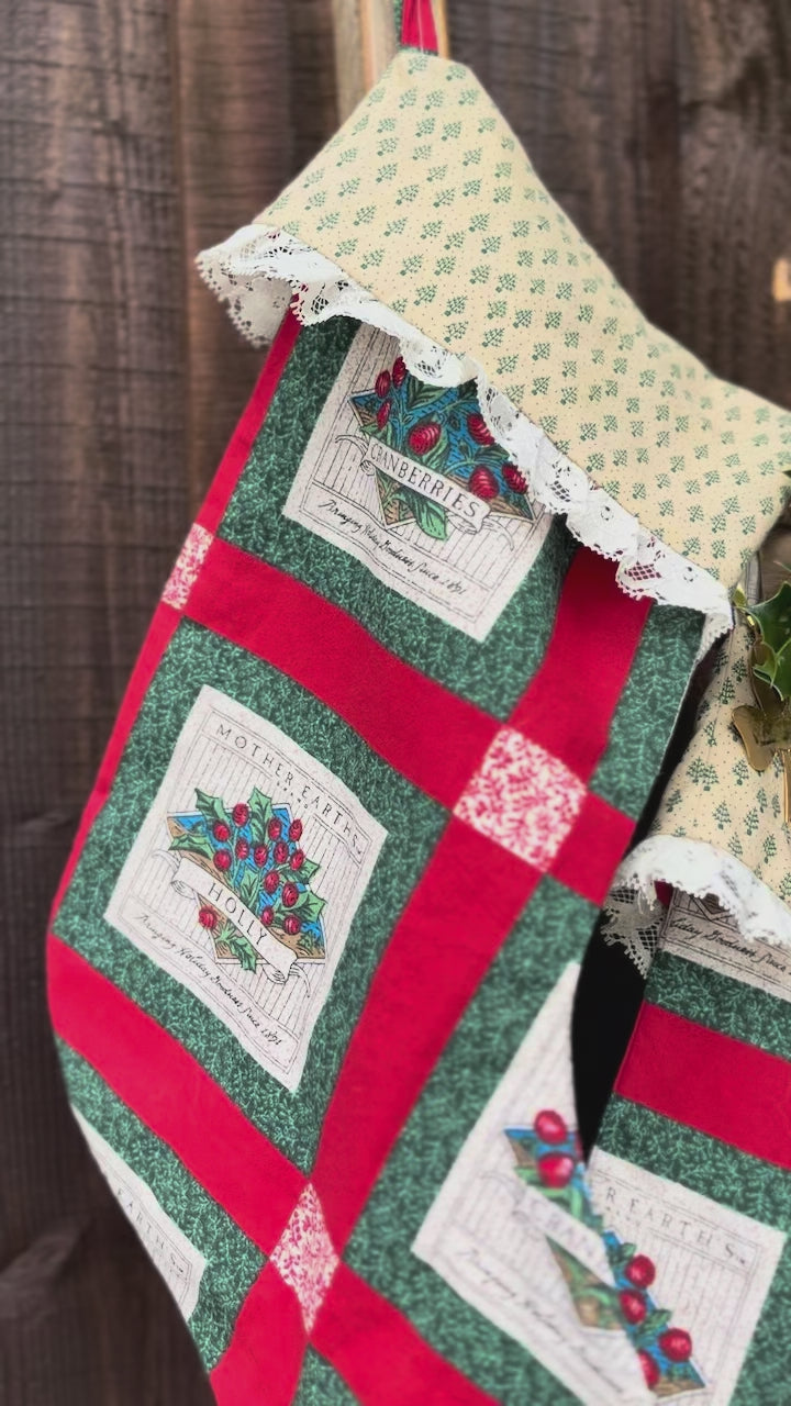 These stockings are sustainably made from second-hand fabrics and lace trim. The green and red fabrics are perfect for traditional Christmas and Ralph Lauren Christmas aesthetics. They are hand-made from cotton textiles and will become favorites for years to come. They are a large size with plenty of room for all the best stocking stuffers. They feature a full lining and sturdy hanging loop for easy decorating, whether you are hanging them on your mantle or staircase.