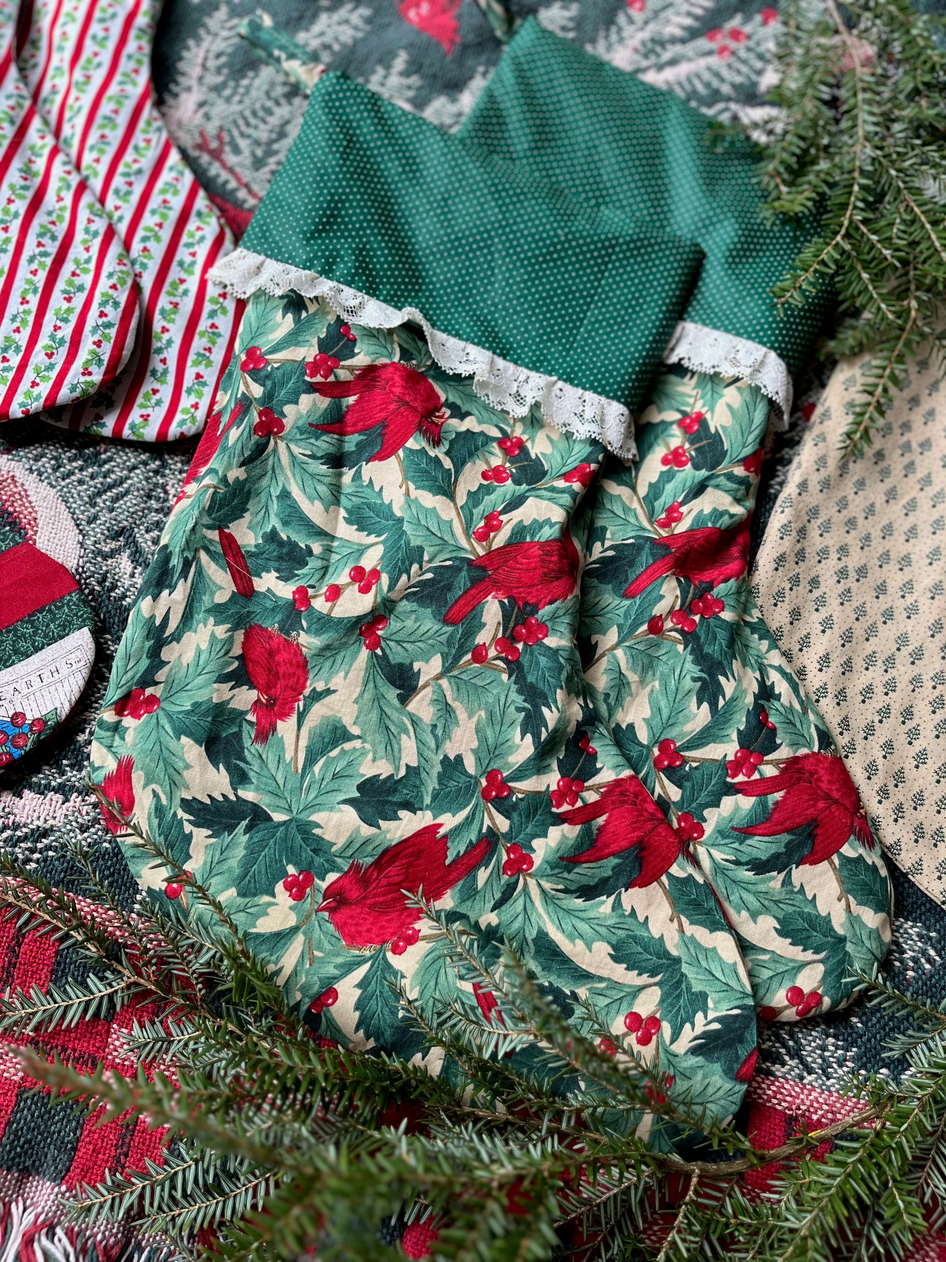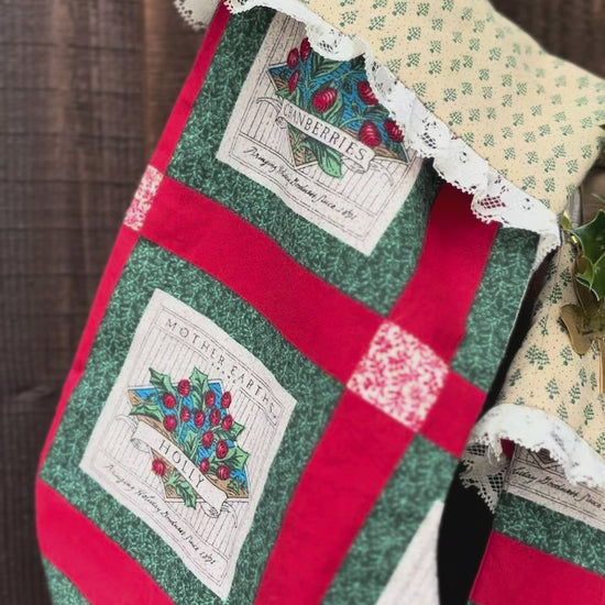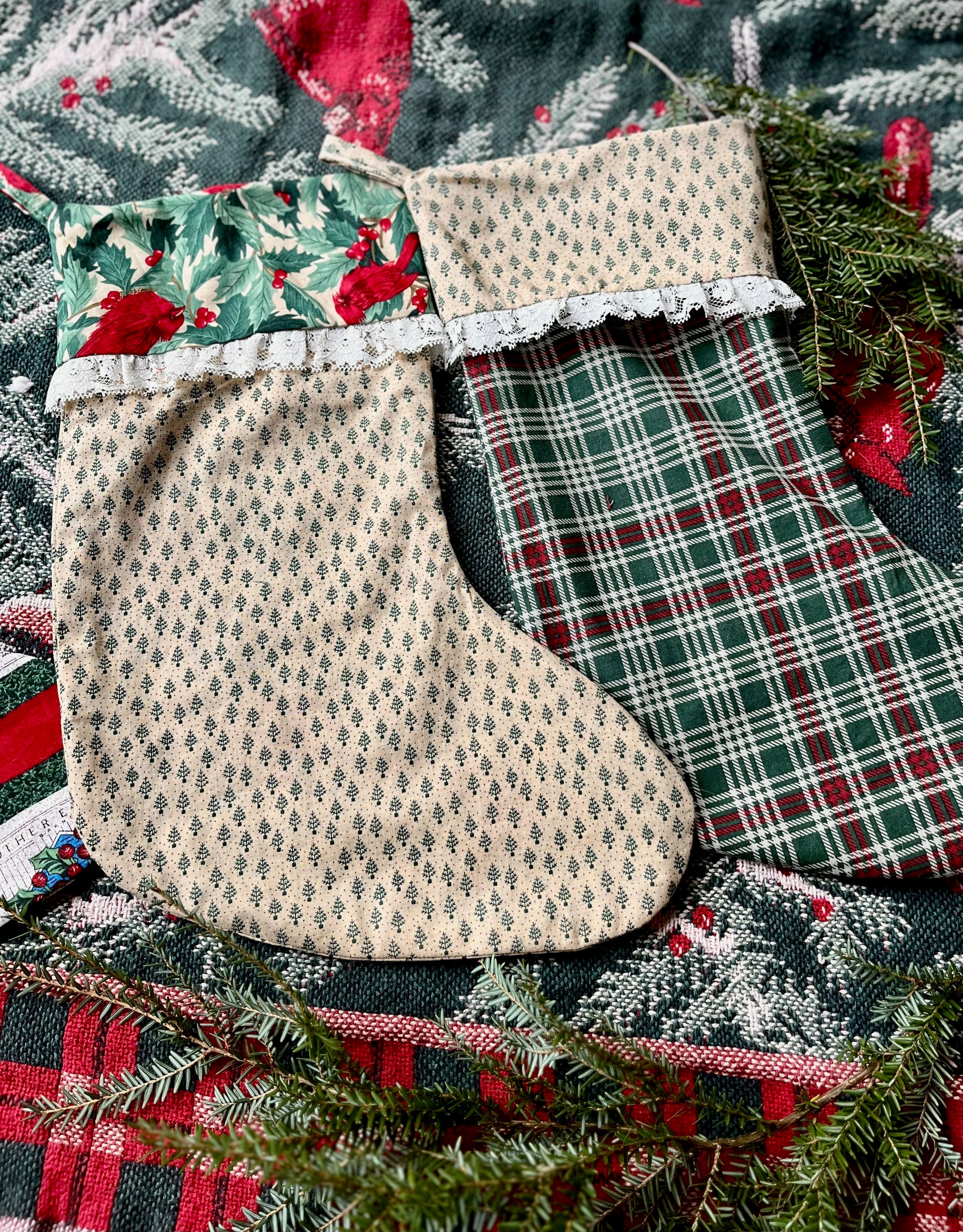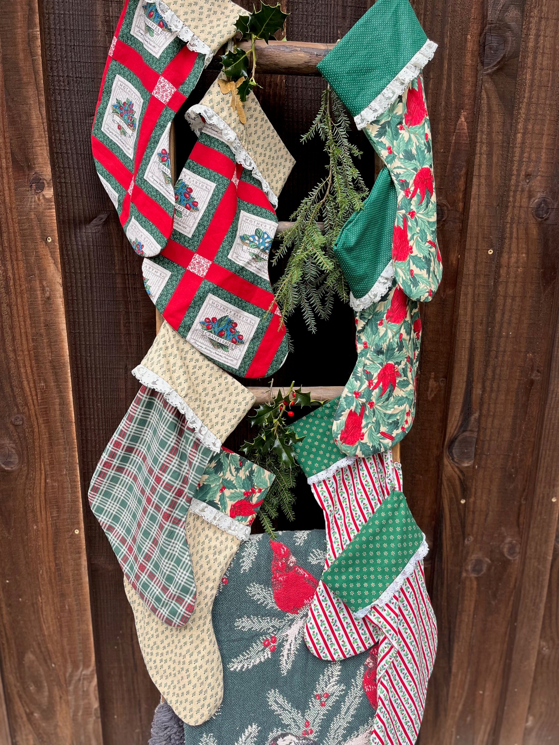 These stockings are sustainably made from second-hand fabrics and lace trim. The green and red fabrics are perfect for traditional Christmas and Ralph Lauren Christmas aesthetics. They are hand-made from cotton textiles and will become favorites for years to come. They are a large size with plenty of room for all the best stocking stuffers. They feature a full lining and sturdy hanging loop for easy decorating, whether you are hanging them on your mantle or staircase.