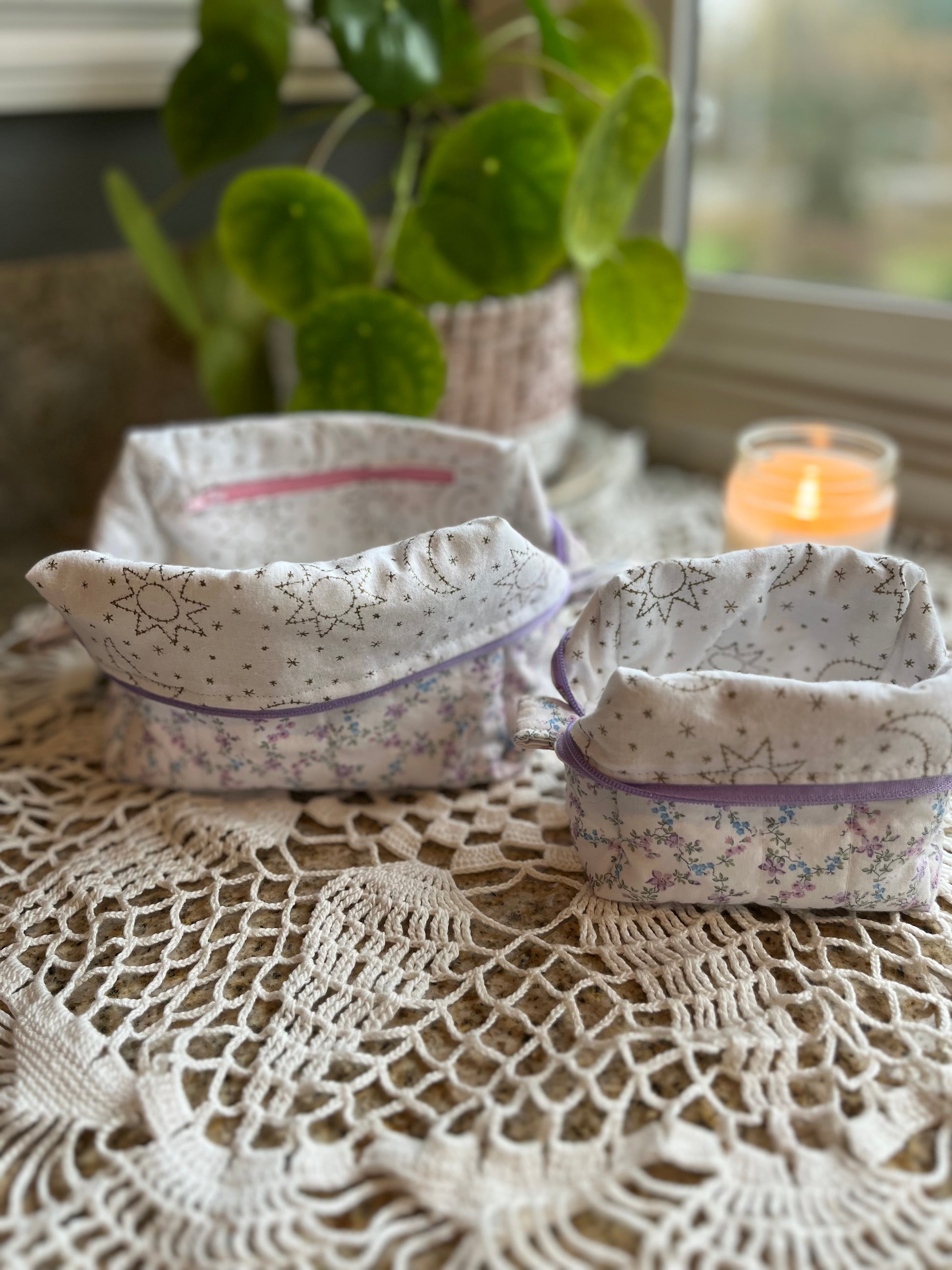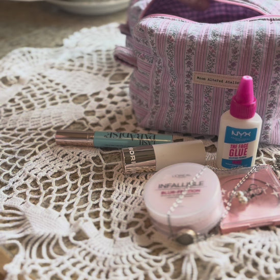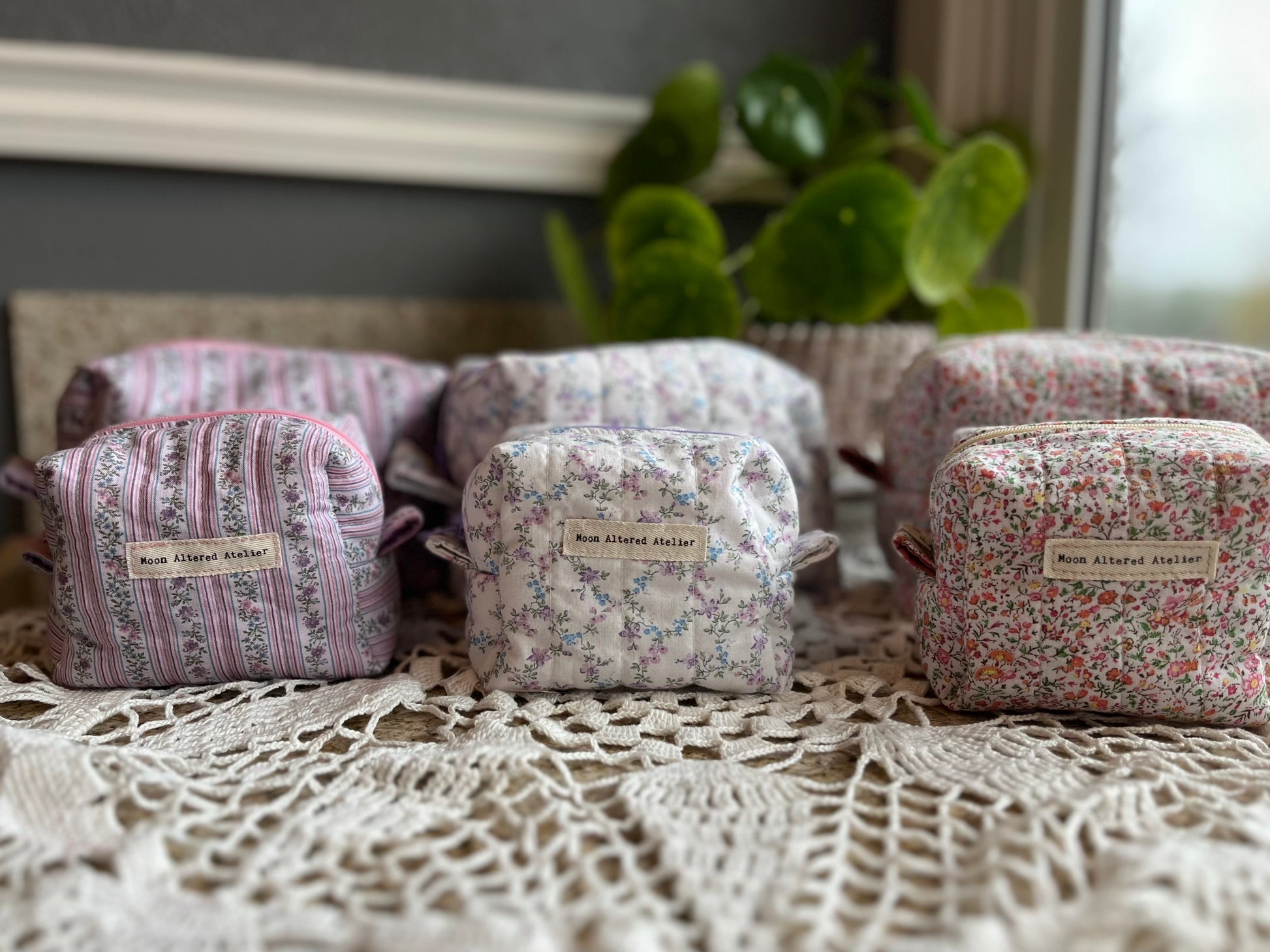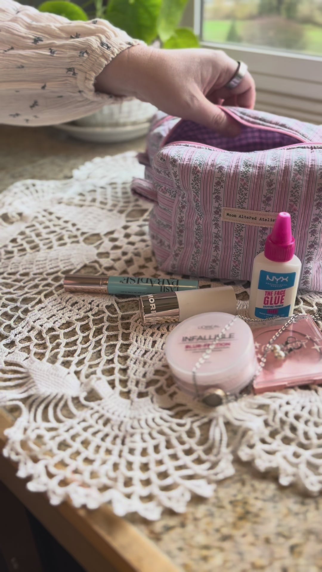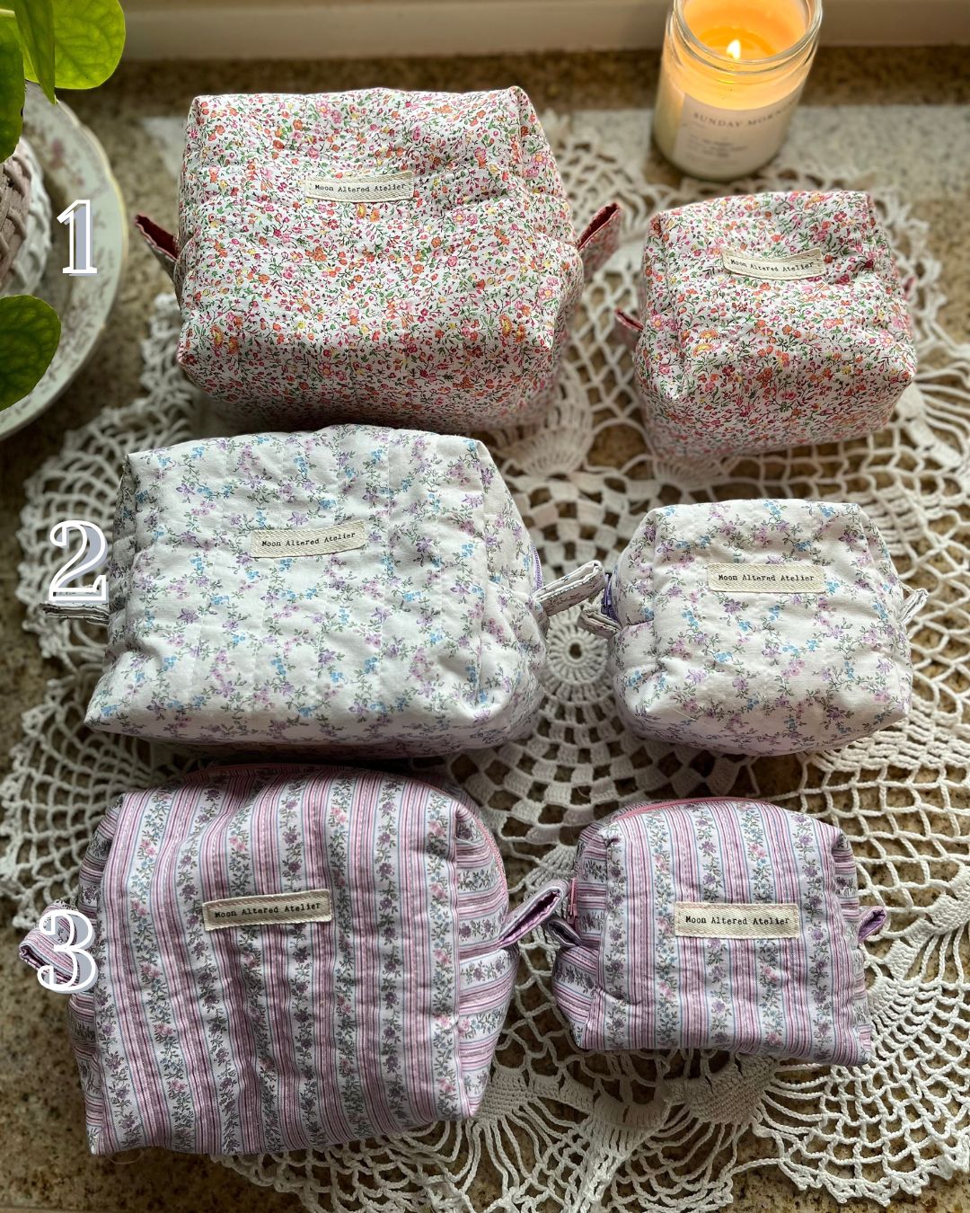 Set of 2 pouches. One medium and one mini size. Perfect for packing light on a vacation or storing your everyday essentials. These bags are soft, durable, and fully lined. They feature zipper closures with easy-to-pull tabs. The medium-sized bag has an extra zipper pocket inside for keeping jewelry safe or small makeup products. The top folds over as pictured to keep the bag open on the vanity or counter.