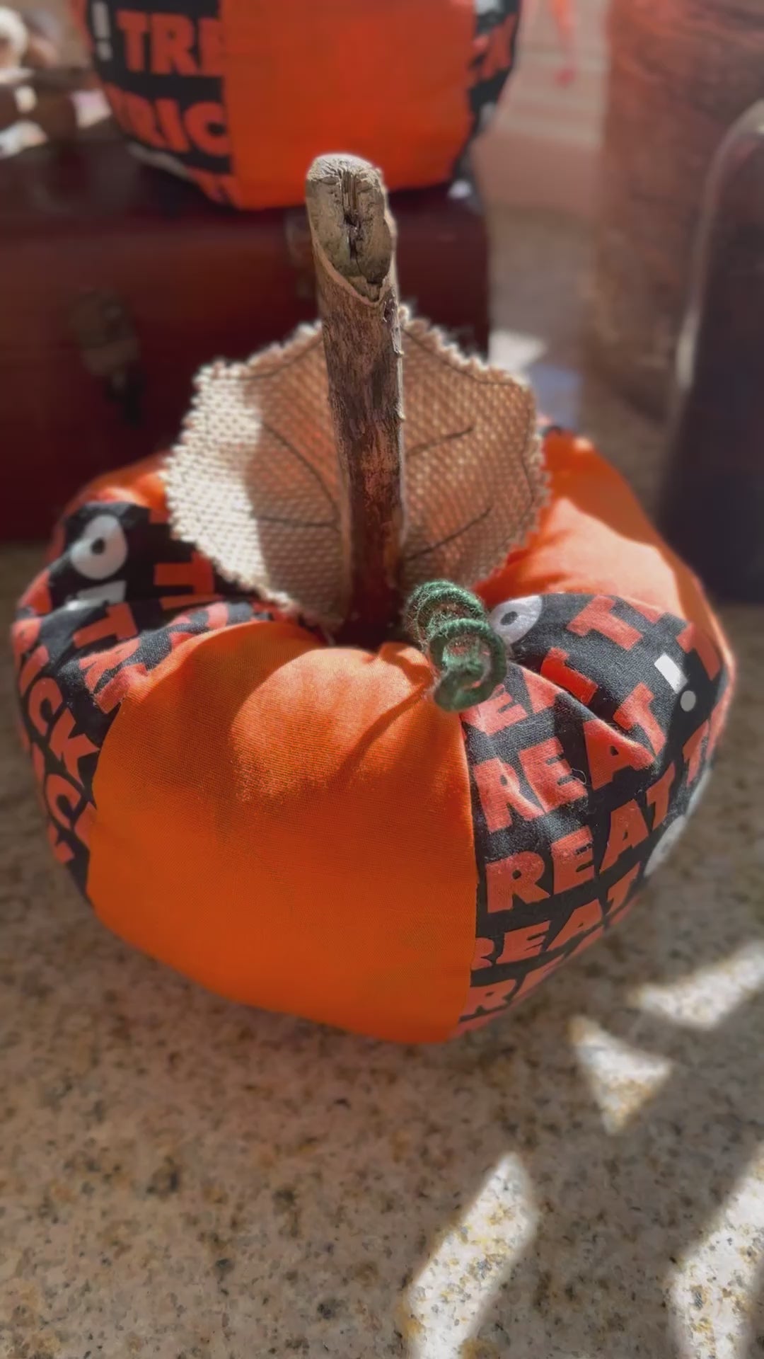 Set of 2 handmade pumpkins for halloween decor. Made from vintage "Trick or Treat" fabric, stuffed with small fabric scraps and a real wooded stem.